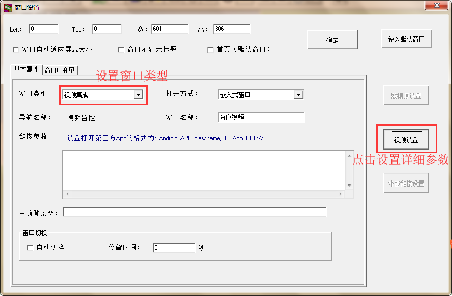新建一個窗口,把該窗口類型指定為視頻集成類型,如下圖: