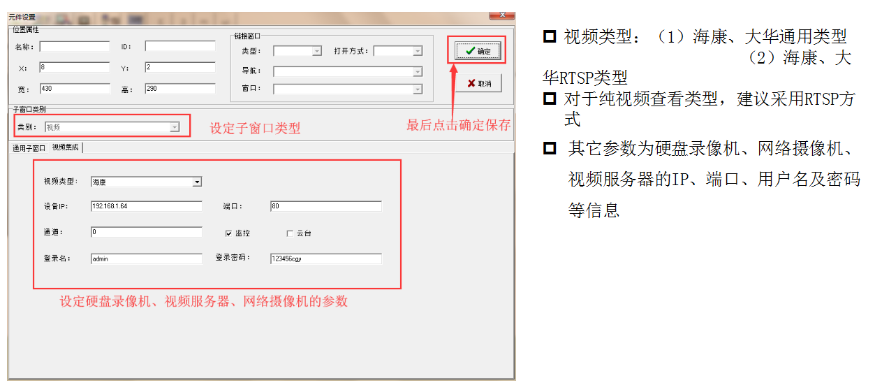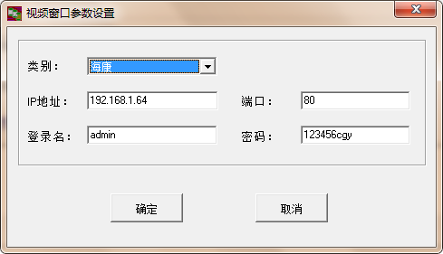 在窗口視頻詳細設置上面設置硬盤錄像機、視頻服務器、網絡攝像頭的IP、端口、用戶登錄信息等。